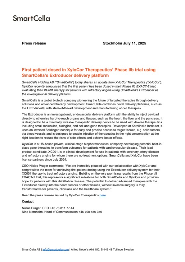 CEO Niklas Prager comments: “We are incredibly pleased with our collaboration with XyloCor and congratulate the team for achieving first patient dosing using the Extroducer delivery system for their XC001 therapy to treat refractory angina. Building on the very promising results from the Phase I/II EXACT-1 trial, this represents a significant milestone for both SmartCella and XyloCor and provides hope for patients with this debilitation disease. The potential to deliver advanced therapies with the Extroducer directly into the heart, tumors or other tissues, without invasive surgery is truly transformative for patients, clinicians and the healthcare system.”
