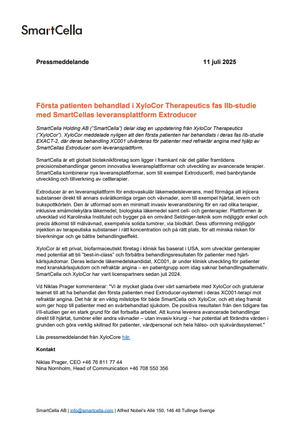 Vd Niklas Prager kommenterar: “Vi är mycket glada över vårt samarbete med XyloCor och gratulerar teamet till att ha behandlat den första patienten med Extroducer-systemet i deras XC001-terapi mot refraktär angina. Det här är en viktig milstolpe för både SmartCella och XyloCor, och ett steg framåt som ger hopp till patienter med en svårbehandlad sjukdom. De positiva resultaten från den tidigare fas I/II-studien ger en stark grund för det fortsatta arbetet. Att kunna leverera avancerade behandlingar direkt till hjärtat, tumörer eller andra vävnader – utan invasiv kirurgi – har potential att förändra vården i grunden och göra verklig skillnad för patienter, vårdpersonal och hela hälso- och sjukvårdssystemet.”