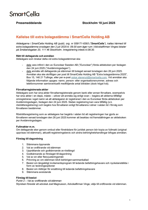 Kallelse till extra bolagsstämma i SmartCella Holding AB