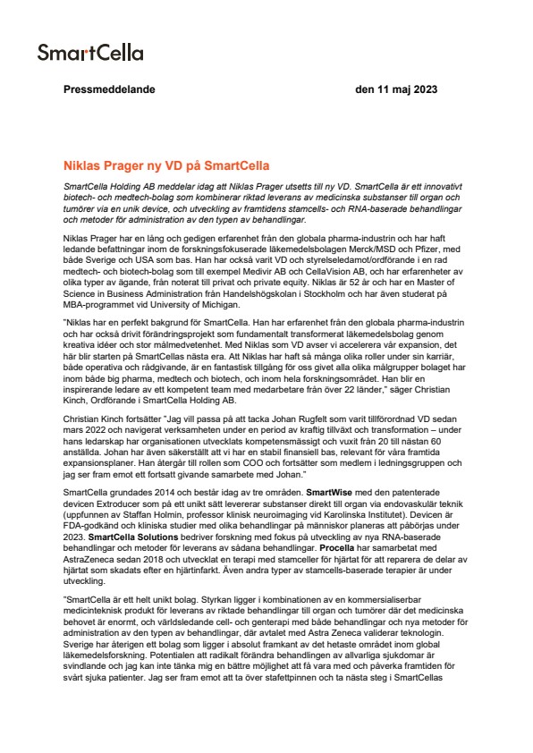 ”SmartCella är ett helt unikt bolag. Styrkan ligger i kombinationen av en kommersialiserbar medicinteknisk produkt för leverans av riktade behandlingar till organ och tumörer där det medicinska behovet är enormt, och världsledande cell- och genterapi med både behandlingar och nya metoder för administration av den typen av behandlingar, där avtalet med Astra Zeneca validerar teknologin. Sverige har återigen ett bolag som ligger i absolut framkant av det hetaste området inom global läkemedelsforskning. Potentialen att radikalt förändra behandlingen av allvarliga sjukdomar är svindlande och jag kan inte tänka mig en bättre möjlighet att få vara med och påverka framtiden för svårt sjuka patienter. Jag ser fram emot att ta över stafettpinnen och ta nästa steg i SmartCellas utveckling tillsammans med styrelsen, ledningen och personalen. Både i bolaget och styrelsen finns en spännande mix av medicinsk och entreprenöriell kompetens med starkt track record och jag ser med stor tillförsikt fram emot vad SmartCella kan åstadkomma,” säger Niklas Prager. Niklas tillträder rollen som VD under sommaren 2023.