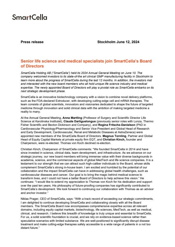 At the Annual General Meeting, Anna Martling (Professor of Surgery and Scientific Director Life Science at Karolinska Institutet), Claude Dartiguelongue (previously senior roles with Lonza, Thermo Fisher Scientific and Becton Dickinson and Company), and Regina Fritsche-Danielson (PhD in Cardiovascular Physiology/Pharmacology and Senior Vice President and Global Head of Research and Early Development, Cardiovascular, Renal and Metabolic Diseases at AstraZeneca) were appointed new members of the SmartCella Board of Directors. Magnus Tornling, Partner and Global Head of Equity Capital Markets at private equity firm EQT, and Christian Kinch, founder and Chairperson, were re-elected. Thomas von Koch declined re-election.