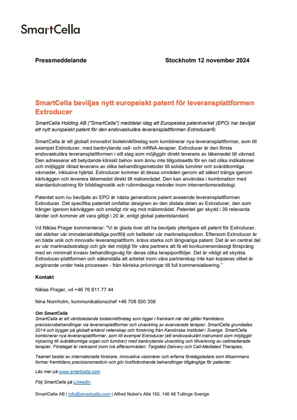 SmartCella är ett globalt innovativt bioteknikföretag som kombinerar nya leveransplattformar, som till exempel Extroducer, med banbrytande cell- och mRNA-terapier. Extroducer är den första endovaskulära leveransplattformen i sitt slag som möjliggör direkt leverans av läkemedel till vävnad. Den adresserar ett betydande kliniskt behov som ännu inte tillgodosetts för en rad olika indikationer och möjliggör riktad leverans av olika behandlingsmetoder till solida tumörer och svåråtkomliga vävnader, inklusive hjärtat. Extroducer kommer åt dessa områden genom att säkert tränga igenom kärlväggen och leverera läkemedel direkt till målområdet. Den kan användas i kombination med standardutrustning för bilddiagnostik och rutinmässiga metoder inom interventionsradiologi.