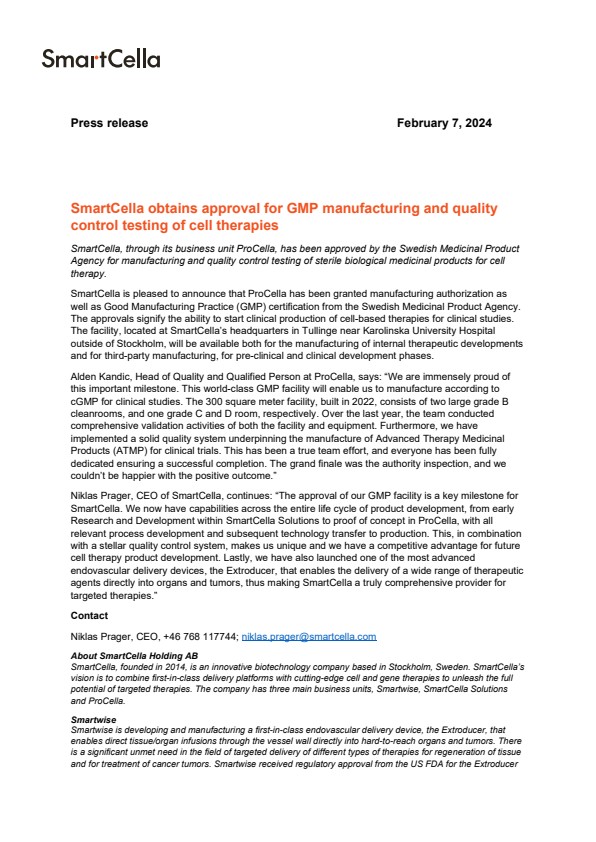 Niklas Prager, CEO of SmartCella, continues: “The approval of our GMP facility is a key milestone for SmartCella. We now have capabilities across the entire life cycle of product development, from early Research and Development within SmartCella Solutions to proof of concept in ProCella, with all relevant process development and subsequent technology transfer to production. This, in combination with a stellar quality control system, makes us unique and we have a competitive advantage for future cell therapy product development. Lastly, we have also launched one of the most advanced endovascular delivery devices, the Extroducer, that enables the delivery of a wide range of therapeutic agents directly into organs and tumors, thus making SmartCella a truly comprehensive provider for targeted therapies.”