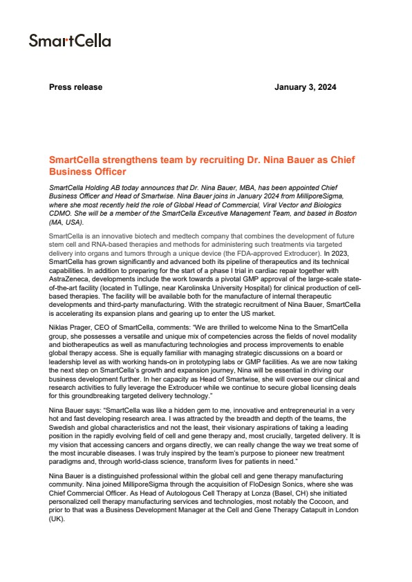 SmartCella Holding AB today announces that Dr. Nina Bauer, MBA, has been appointed Chief Business Officer and Head of Smartwise. Nina Bauer joins in January 2024 from MilliporeSigma, where she most recently held the role of Global Head of Commercial, Viral Vector and Biologics CDMO. She will be a member of the SmartCella Exceutive Management Team, and based in Boston (MA, USA).