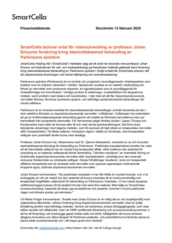 Johan Ericson kommenterar: ”De prekliniska resultaten vi har fått hittills är mycket lovande, och vi är övertygade om att vår metod har stor potential att kunna utvecklas till en konkurrenskraftig och terapeutiskt högeffektiv cellprodukt för behandling av Parkinsons i framtiden. Vi har också anpassat celltillverkningsprocessen till ett skalbart format med xeno-fria material. Med hjälp av SmartCellas processutveckling, kapacitet att skala upp produktionen och expertis, kommer vi kunna påskynda vägen mot kliniska studier på människor.”